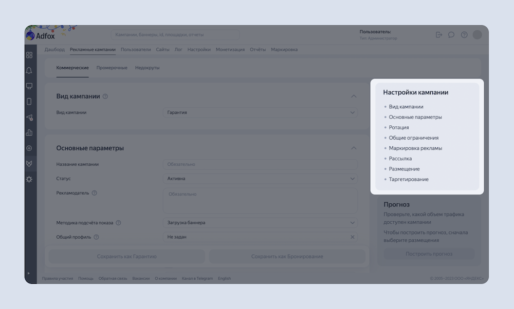 Кроме того, кампании вида «Гарантия» теперь можно сохранять как «Бронирование», чтобы зарезервировать инвентарь под будущие прямые продажи. Такие кампании не имеют активных показов, но учитываются при построении прогнозов в других кампаниях, претендующих на тот же трафик, что и кампания вида «Бронирование».