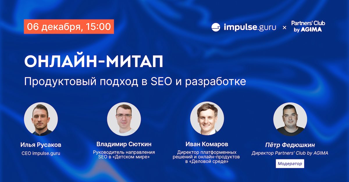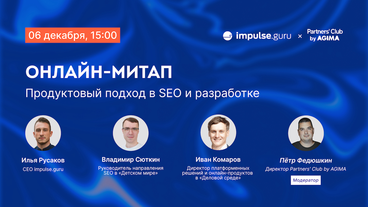 В числе участников митапа заявлены: руководитель направления SEO в «Детском мире» Владимир Сюткин, директор платформенных решений и онлайн-продуктов в «Деловой среде» Иван Комаров и CEO impulse.guru Илья Русаков. В роли модератора выступит директор Partners’ Club by AGIMA Петр Федюшкин.