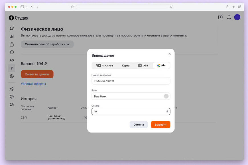 Чтобы подключить вывод денег через СПБ, нужно зайти в раздел «Монетизация» в Студии, нажать кнопку «Вывести деньги», выбрать вкладку СБП (крайняя справа), ввести номер телефона, выбрать свой банк и указать сумму для вывода (более 10 рублей). Кликнув на кнопку «Вывести», остается только дождаться зачисления денег на счет.