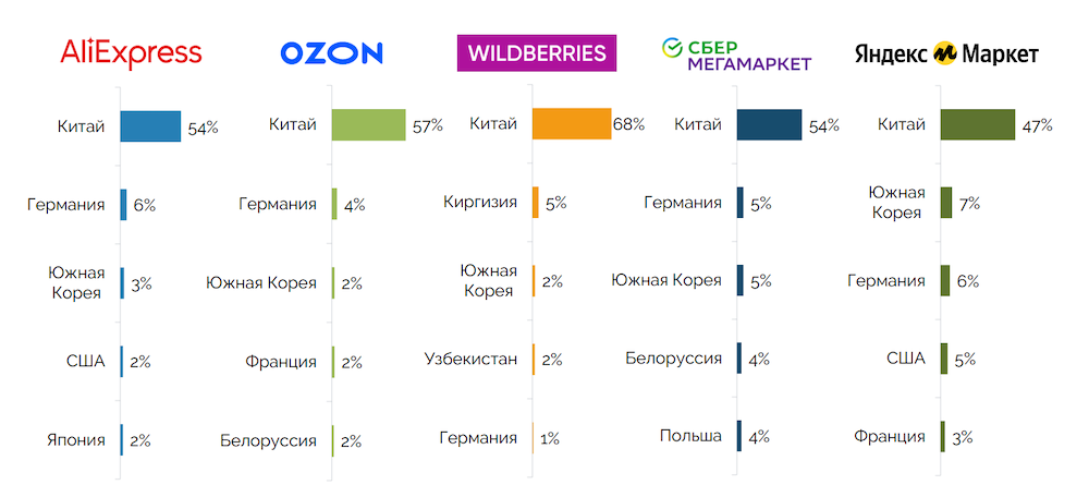 Китайские товары пользуются спросом на всех 5 площадках. Более того: именно Поднебесная — ключевой поставщик товаров на все маркетплейсы, о чем свидетельствуют исследования агентства Data Insight: