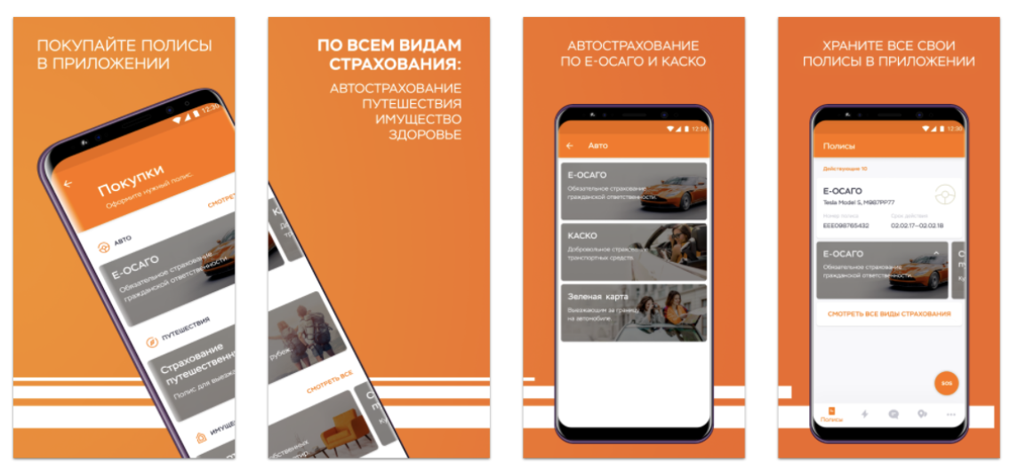Приятное впечатление оставляют скриншоты, которые взаимосвязаны между собой и вместе выглядят как единое целое. Такую концепцию дизайна скриншотов мы подготовили для страховой компании «Согласие». Брендовый цвет страховой компании — оранжевый, мы внесли его в дизайн. На скриншотах мы отобразили, с какими видами страхования работает приложение: