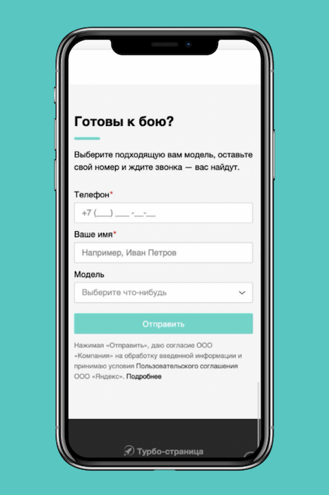 На вновь созданной турбо-странице была оставлена только самая важная информация и окошко для введения номера телефона.