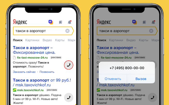 Часто, когда люди ищут товары или услуги с мобильного устройства, они хотят сделать заказ здесь и сейчас. С помощью визитки можно эффективно обработать этот «горячий» спрос: в объявлении отображается телефон из визитки, и пользователю достаточно нажать на него, чтобы набрать нужный номер: