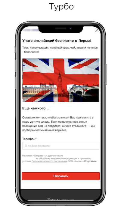 В качестве примера можно привести эксперимент, проведенный на базе мобильной версии сайта и турбо-страницы Школы английского языка.