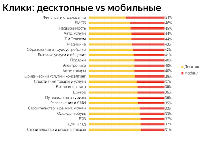 Если рассмотреть статистику по рекламным кликам с десктопов и мобильных, то можно увидеть, что в некоторых тематиках количество последних уже перевалило за 50%, а в некоторых неуклонно стремится к этому. Это говорит о том, что постепенно взаимодействие клиентов с рекламой, а также пользователей с сайтами, перемещается с десктопа в мобайл.