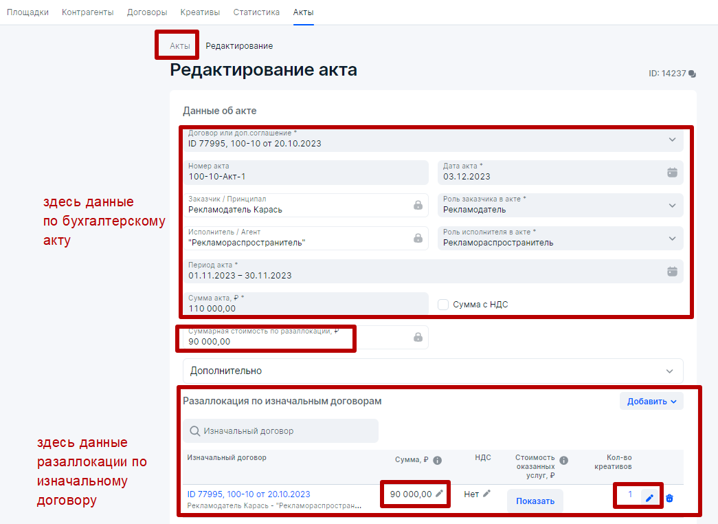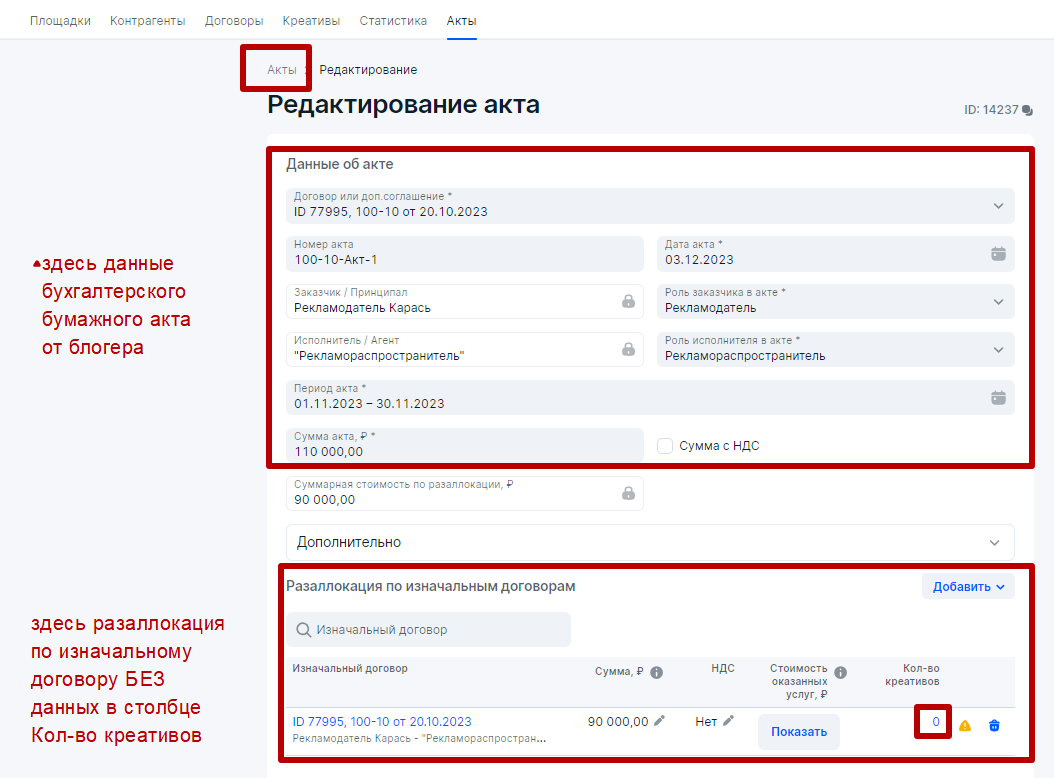 В блоке Акты блогер заполнит верхнюю часть на основании своего бухгалтерского бумажного акта либо чека из Мой Налог, если РР физлицо в статусе самозанятого,   и стороны работают без договора. А также произведет разаллокацию по Изначальному договору (Рекламодатель Карась — Агентство Кобра) без добавления данных по креативам.