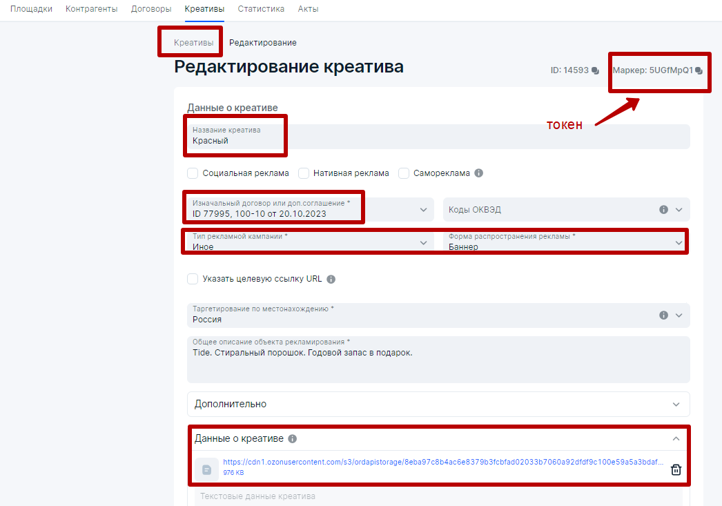 3. По текущему сценарию РР должен обеспечить загрузку креативов и получение токенов в  ОРД. Причем креатив должен быть прикреплен к Изначальному договору, а это договор  Рекламодатель Карась — Агентство Кобра для нашей рекламной цепочки по текущему сценарию.