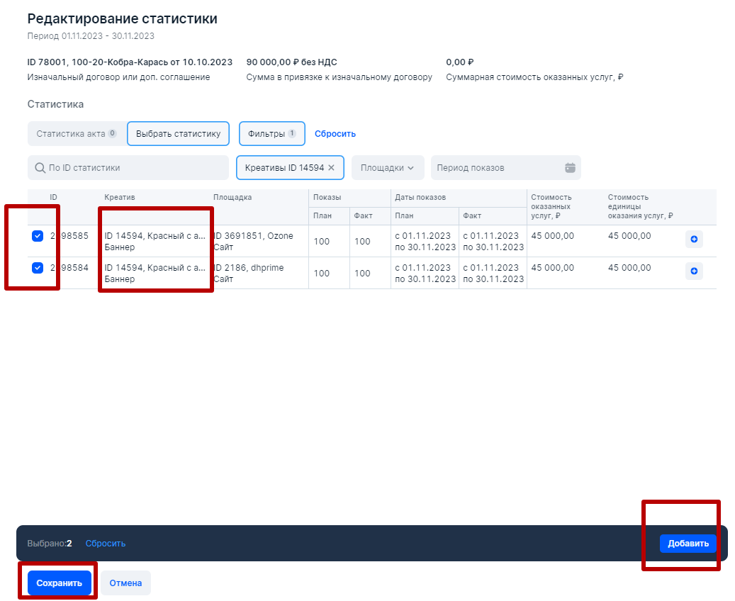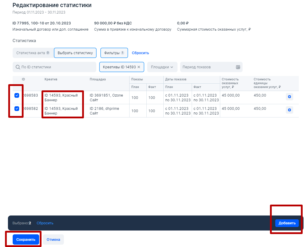 В нижнем блоке (блок разаллокации по Изначальному договору) блогер сначала выберет Изначальный договор (как указано выше, в нашем случае Изначальный договор и договор РД-РР это одно и тоже) укажет сумму 90 000 рублей, так как именно она была потрачена непосредственно на размещение рекламных материалов. Затем укажет НДС либо нет, а далее нажмет Сохранить. В итоге, в интерфейсе появится карандашик в столбце Количество креативов, при нажатии на который, откроется  блок Статистика, где можно выбрать наш креатив, который был размещен на двух площадках: