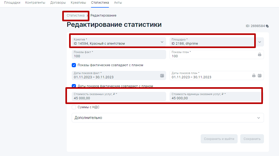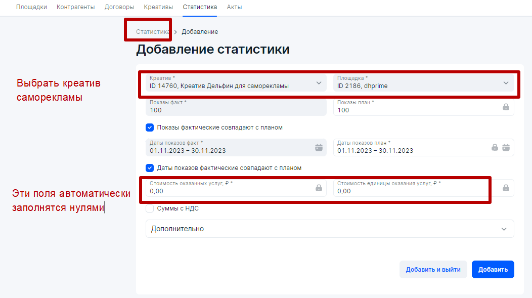 Далее, после размещения требуется оформить отчетность о саморекламе в блоке Статистика и больше нигде, что очень удобно. Ранее приходилось также создавать акт с нулевыми суммами  и нулевой разаллокацией в блоке Акты: