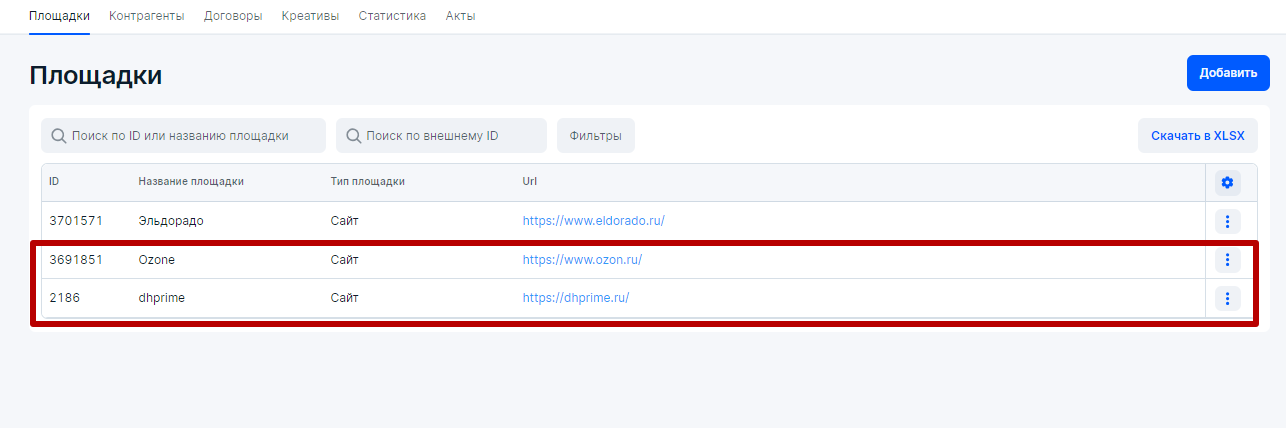 Сначала для удобства следует оформить блок Статистика, где блогер (РР) занесет данные по показам для каждого креатива и для каждой площадки. Так как у нас креатив был один, то в блоке Статистика будет присутствовать две строчки – каждая для своей площадки. Итак, в блоке Статистика нажмем Добавить и поэтапно добавим каждую площадку. Напомним, площадки размещения РИМ мы добавили в самом начале практической части и прикрепили их к РР (рекламораспространитель).