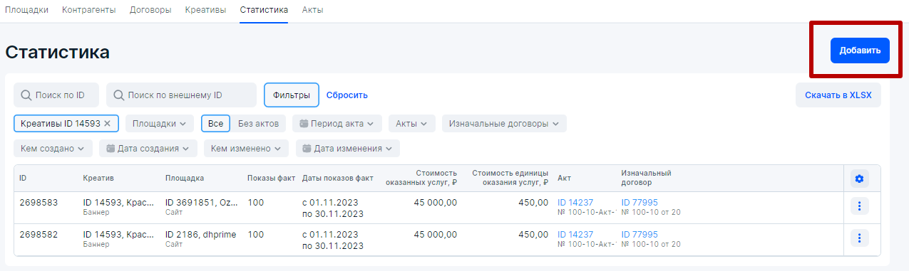 В итоге у нас получилось две строчки в блоке Статистика – каждая строчка для отдельной площадки размещения. Если бы у нас было два креатива и одна площадка, то также в блоке Статистика у нас было бы две строчки – каждая строчка для отдельного креатива, но на одной площадке. Если бы у нас было два креатива на двух площадках, то в блоке Статистика присутствовало бы четыре строчки. Это и есть разаллокация (детализация), которую требует Роскомнадзор при построении отчетности в ОРД.