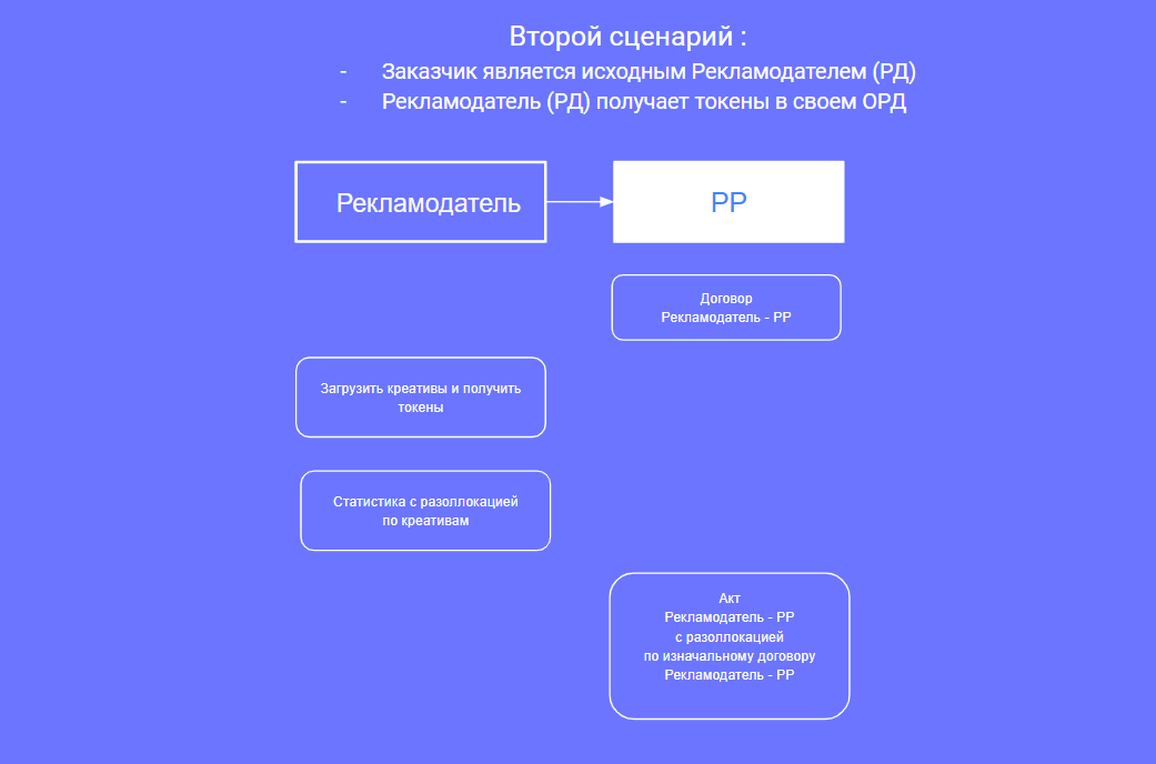 По данному сценарию для блогера существенно снижается объем работ, так как РР не загружает креативы и не получает токены в ОРД. Стороны договорились, что токены по каким-либо причинам будет получать РД в своем ОРД.