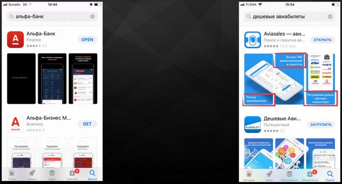 - В результатах поиска App Storе есть кнопка «установить», позволяющая начать установку приложения прямо со страницы выдачи, в результатах поиска Google Play такой кнопки нет, она скрыта в выпадающем меню
