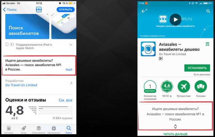 - В App Storе есть подзаголовок (30 символов), который отображается на поиске, а в Google Play есть краткое описание (80 символов), которое в поиске не отображается.