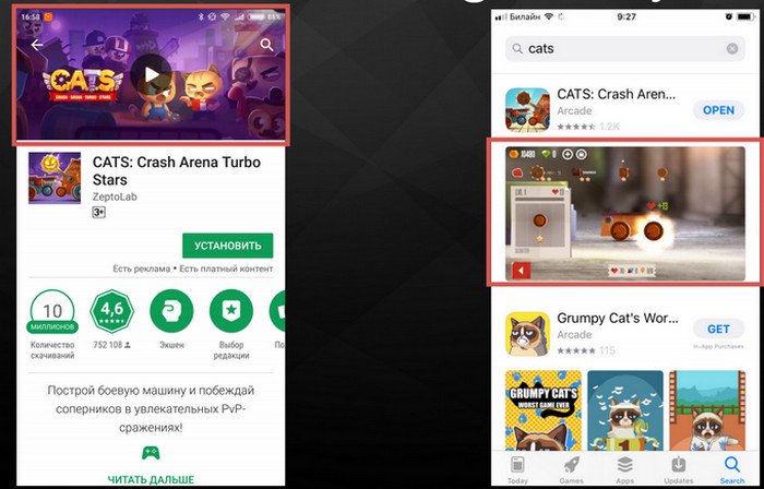 В последнее время страницы приложений в обоих сторах стали очень похожи. Однако в Google Play в самом верху предусмотрено место для промо-баннера приложения, где можно разместить уже упомянутое выше видео, либо статичную картинку с любым текстом, который нужно для пользователя донести.