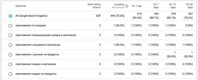 Кроме того в Ap Store и в Google Play можно посмотреть органический трафик из поиска, отмечая его уменьшение или увеличение после проведенных работ.