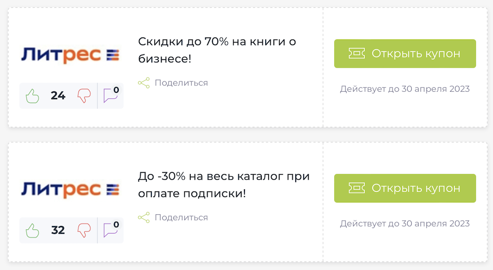 Опыт Адмитад и Promoland доказывает, что, пренебрегая промокодными сайтами, рекламодатели могут потерять в разы больше, чем от каннибализации трафика. Так, продвижение эксклюзивного промокода на скидку вместе с Promoland помогло онлайн-библиотеке ЛитРес увеличить количество продаж в 2,6 раз за 3 месяца.