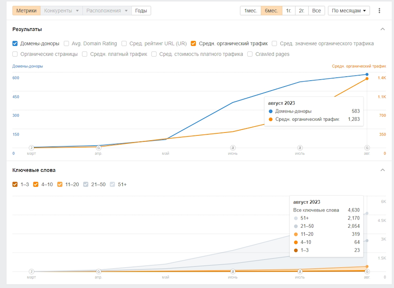 Количество ссылающихся на сайт уникальных доменов за 6 месяцев увеличилось с 66 до 626, при этом общее число ссылок, зарегистрированное сервисом аналитики Ahrefs, составило 3000. Важно, что добиться прироста ссылочного профиля удалось с сохранением естественной динамики, не провоцируя грубую ошибку — так называемый ссылочный взрыв — как это нередко происходит у начинающих SEO-специалистов.