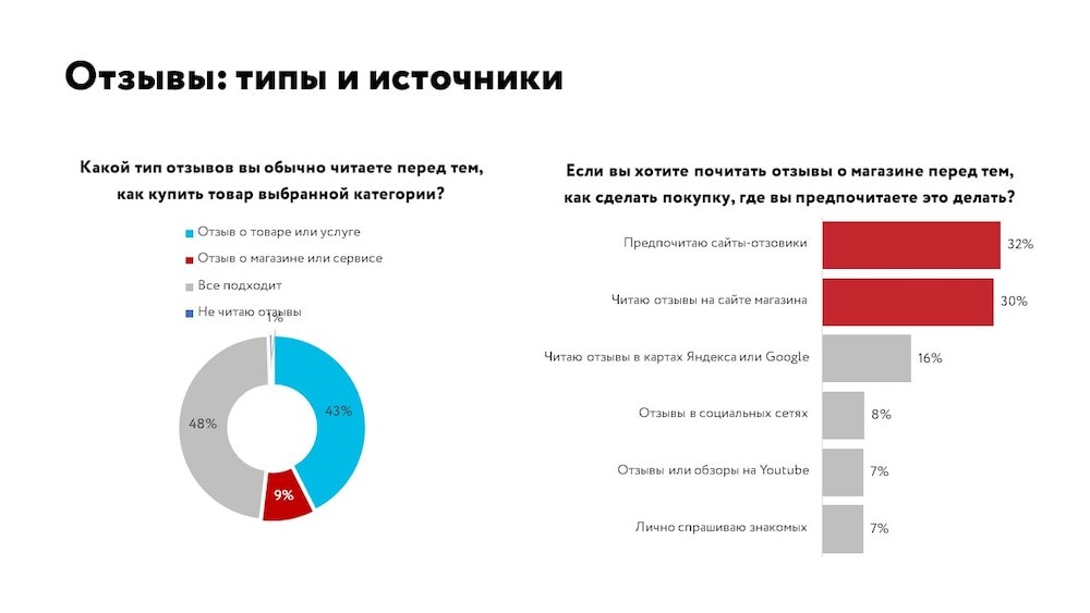 Почти половина пользователей (48%) изучают перед покупкой отзывы и о товарах и о магазинах. Однако если сравнивать типы отзывов, со значительным перевесом предпочтение отдается отзывам о товаре ― 43% против 9%. Наличие негативного отзыва о товаре является отталкивающим от покупки фактором для 30% опрошенных, наличие негативного отзыва о продавце ― для 22%.