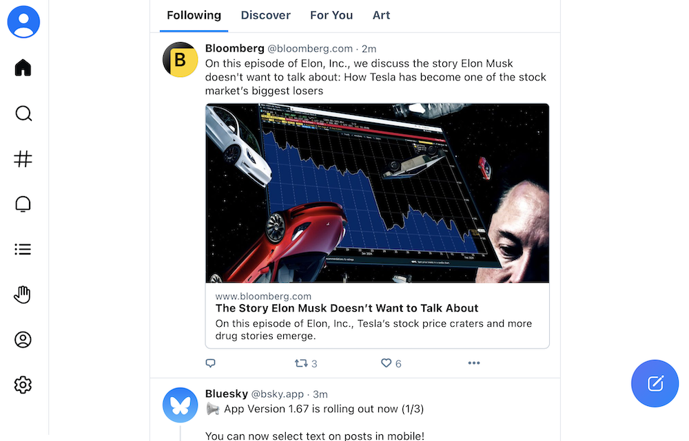 Пользователи Bluesky могут подписываться на ленты, где алгоритмы отдают больший приоритет популярным во всей соцсети публикациям или тем, что больше всего понравились пользователям, на которых подписан человек. Есть также ленты с тематическим контентом — например, про науку или искусство.