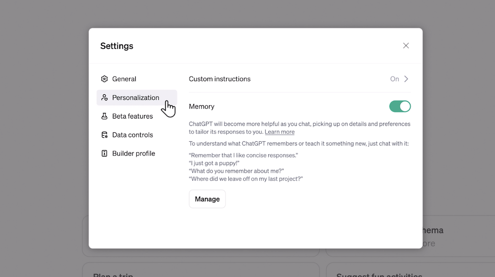 Пользователи смогут полностью контролировать память ChatGPT через раздел настроек чат-бота. Также можно прямо в переписке сказать боту, чтобы он что-то запомнил, уточнить что именно он запомнил, или попросить что-то забыть.