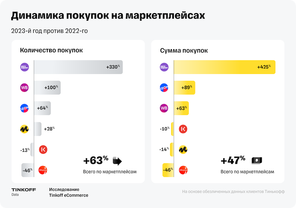 Россияне в 2023 году стали почти в полтора раза больше тратить на покупки на маркетплейсах, чем в предыдущем году. Согласно исследованию Tinkoff eCommerce, количество транзакций на маркетплейсах за год выросло на 63%. Лидерами по росту количества покупок стали: Мегамаркет – число транзакций выросло в 4,3 раза, Wildberries – в 2 раза и Ozon – в 1,6 раза.