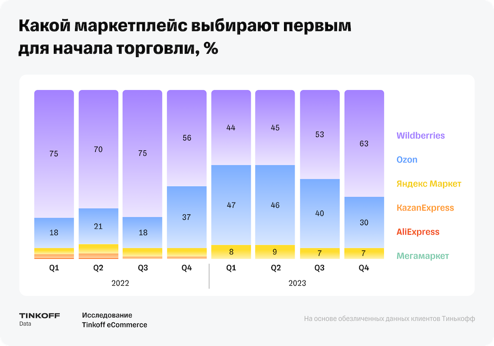 Самой привлекательной платформой для старта бизнеса, как и в прошлом году, является Wildberries: 63% продавцов в конце 2023 года выбирали ее в качестве первой площадки. При этом в начале года по этому показателю лидировал Ozon (47% продавцов против 44% у Wildberries на 1 января 2023 года). В конце года Ozon выбирали первой площадкой 30% продавцов. Около 7% продавцов выбирают для старта бизнеса Яндекс Маркет — его доля по этому показателю за год колебалась незначительно.