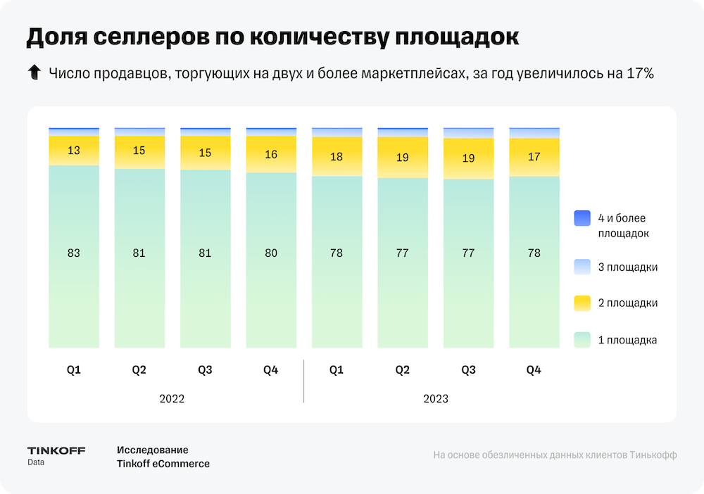 Замедление темпов прироста количества продавцов на маркетплейсах аналитики связывают с высоким оттоком среди небольших игроков, бизнес которых не смог достигнуть необходимых оборотов за определенный период. Вместе с тем рынок становится более зрелым: место неопытных продавцов занимают более профессиональные. Они ведут бизнес более уверенно, укрепляют свои позиции на площадках и торгуют на нескольких платформах одновременно. Количество селлеров, ведущих торговлю на двух и более маркетплейсах, за год увеличилось на 17%.