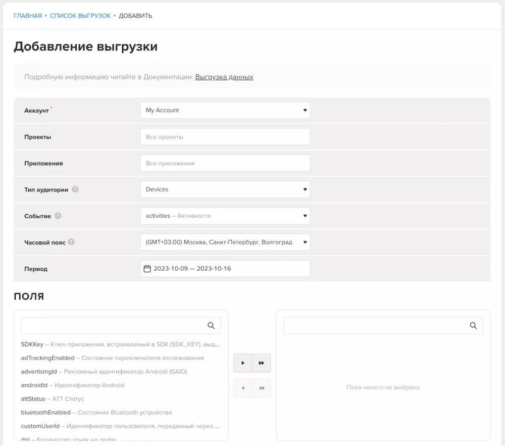 Чтобы выгрузить сырые данные из MyTracker, нужно в разделе «Инструменты» выбрать «Выгрузки данных». Далее нужно нажать «Добавить» и заполнить необходимые поля: