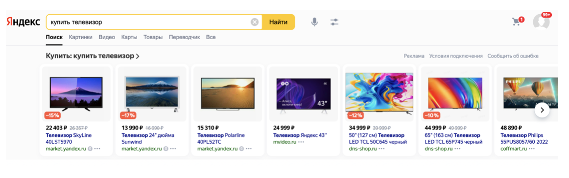 Она находится под поисковой строкой в виде карусели с карточками товаров. Одновременно возможно размещение 36 карточек. Потенциальный покупатель получает конкретное предложение в ответ на свой запрос: бренд, внешний вид, цена. Если продукт заказчика не уступает конкурентам по этим критериям – лид ваш. Кроме того, так вы защищаете себя от недействительных кликов.