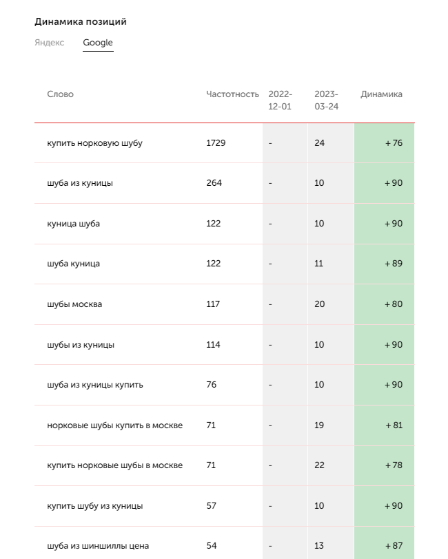 Динамика позиций и страницы, попавшие в топ