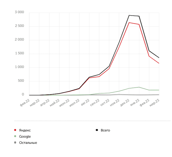 3.  Трафик из органики вырос в 3000 раз. Если в мае 2022 он составлял 29 посетителей в месяц, то в декабре-январе мы наблюдали уже около 3000 визитов: