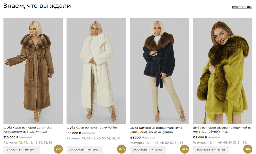 Здесь все сделали по классике: на главную добавили популярные товары и товары по акции или со скидкой. Это позволяет посетителям не искать такие предложения по каталогу. В ассортименте нашего клиента были и шубы по 7 миллионов, и недорогие изделия от ста с небольшим тысяч. Последние и попали на главную: